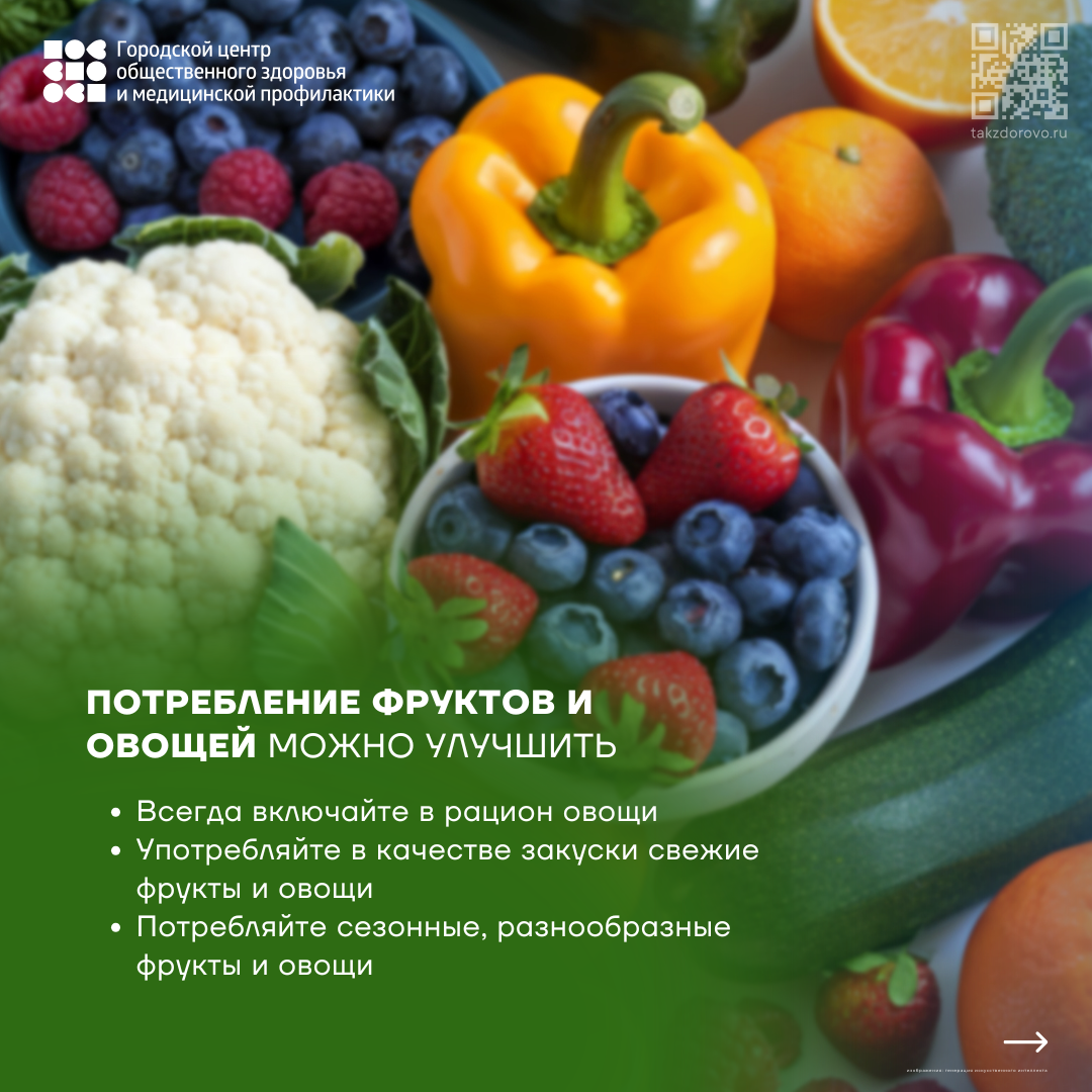 - Включаем в повседневный рацион фрукты и овощи. Рекомендуемая норма потребления фруктов и овощей должна составлять не менее 400 г в день.